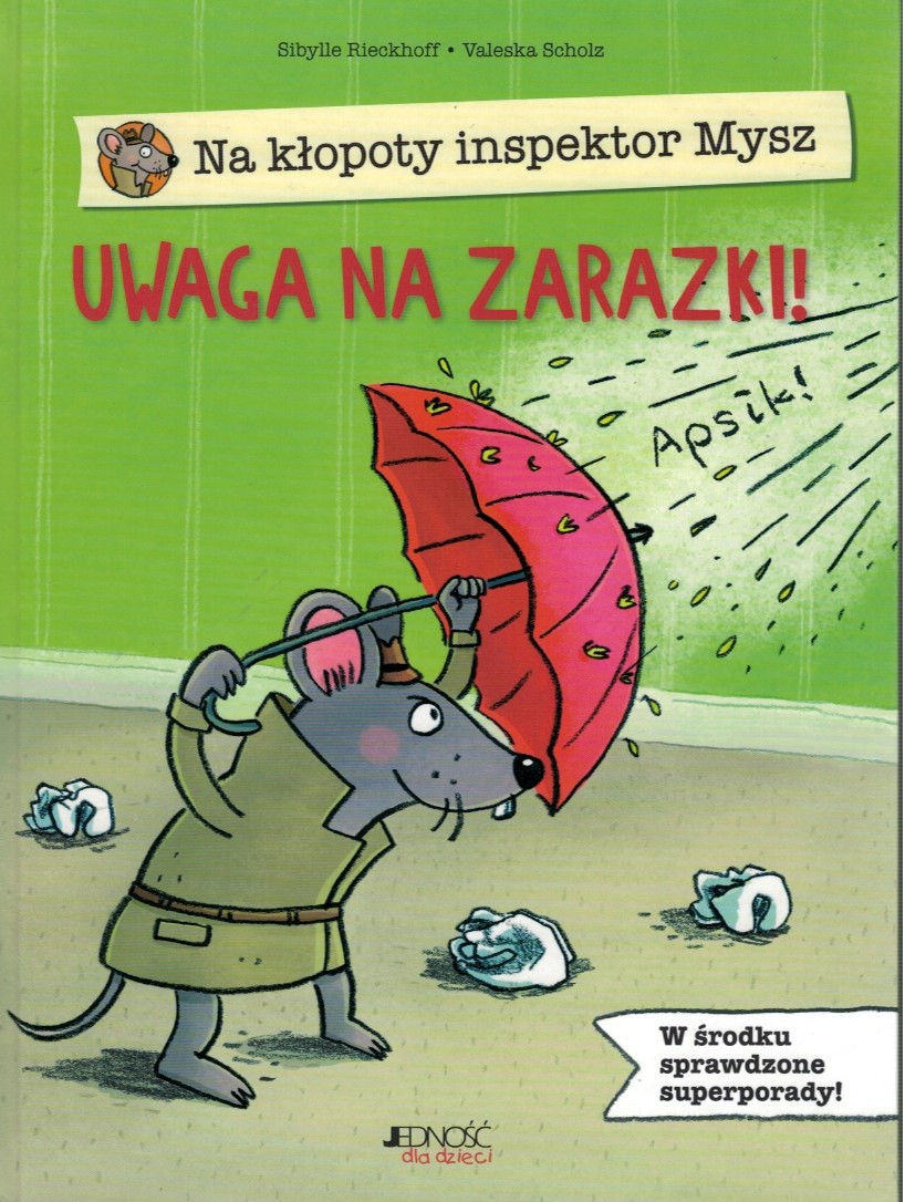Inspektor Mysz to superbohater, który spieszy na pomoc wszystkim dzieciom! W tym tomiku zmierzy się z okropnymi zarazkami, które lubią rozpanoszyć się w nosach i gardłach dziewczynek i chłopców i sprawić, że muszą położyć się do łóżka i zapomnieć o wesołej zabawie. Dla inspektora Myszy to jednak nie problem! W mig poradzi sobie z nieprzyjemnymi infekcjami i dzieci znów odetchną pełną piersią! Jeśli i wy chcecie pokonać niefajne wirusy i bakterie, koniecznie zaprzyjaźnijcie się z inspektorem Myszą i przeczytajcie tę świetną książkę!